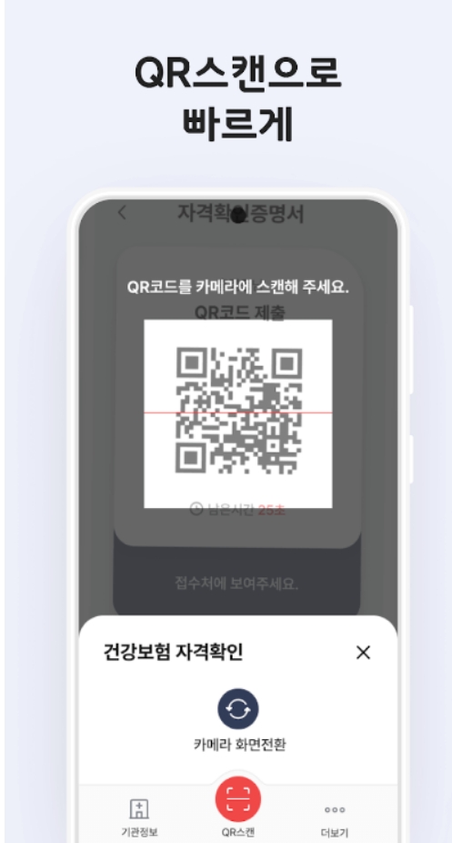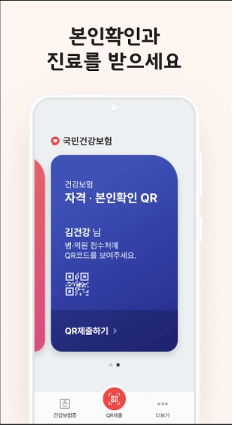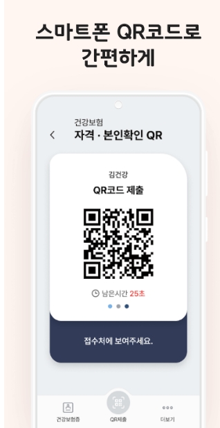 먼저 모바일 건강보험공단 앱을 열고 생체 인증, 또는 비밀번호를 입력 후 QR코드 제출 버튼을 클릭하면