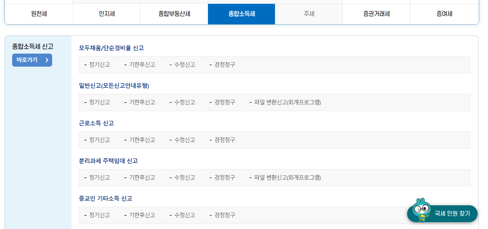 2.세금신고 버튼을누르면 위와같은 화면이 뜨는데 종합소득세 부분을 클릭해줍니다.