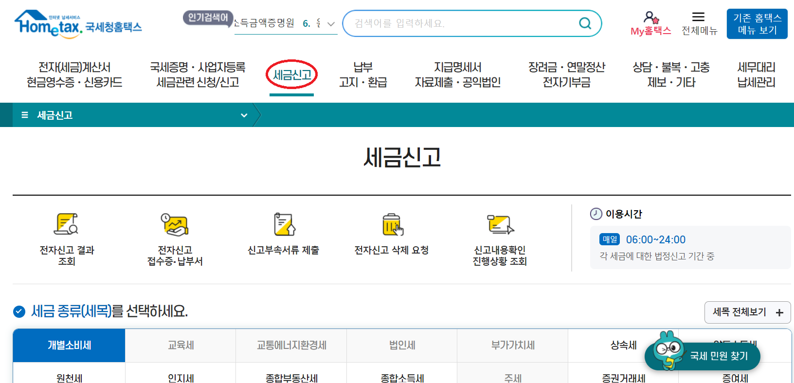 1. 먼저 홈택스 홈페이지에 접속하여 빨간색 동그라미가 쳐진 세금신고 버튼을 클릭합니다.